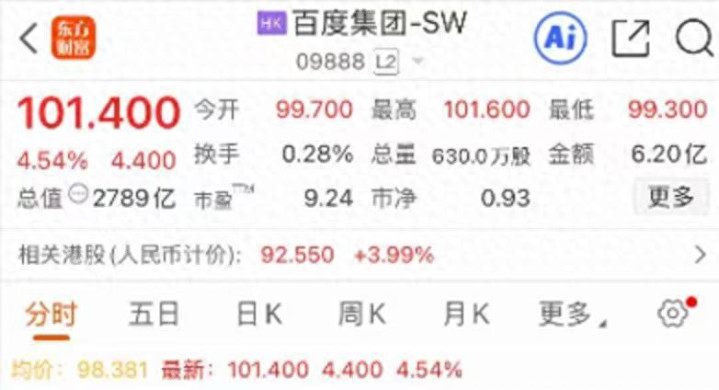 9月8日,继百度美股收涨近4%至101.96美金,港股开涨4.54%至101.4港币,股价双破百均创半年内新高。多家机构报告显示,萝卜快跑在全球无人驾驶市场领先优势明显。